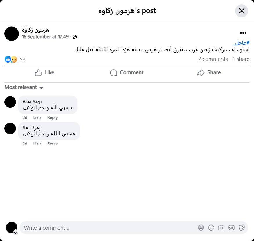 استهـداف مركبة نازحين قرب مفترق أنصـار غربي مدينة غزة للمرة الثالثة قبل قليل