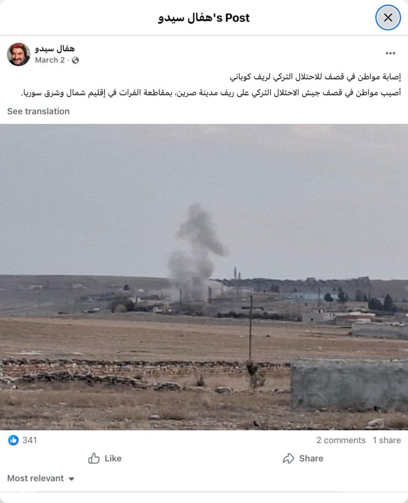 أصيب مواطن في قصف جيش الاحتلال التركي على ريف مدينة صرين، بمقاطعة الفرات في إقليم شمال وشرق سوريا.