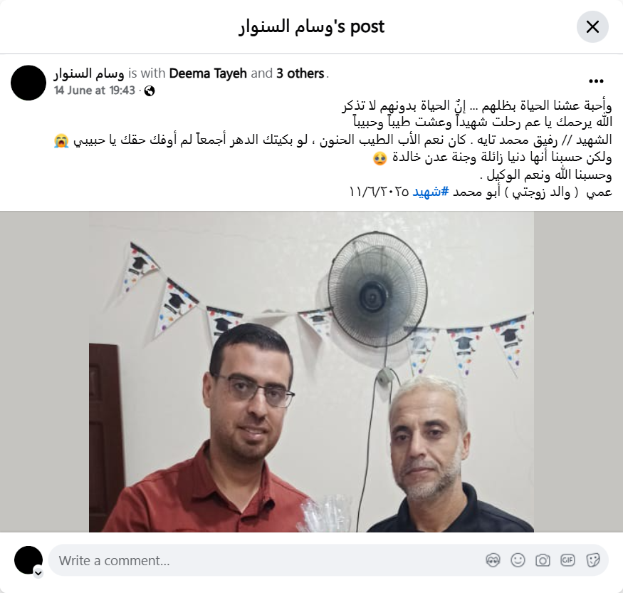 And beloved ones, we lived life in their shadow... Life without them is not worth mentioning. May God have mercy on you, uncle. You departed as a martyr, and you lived a good and beloved life. The martyr // Rafiq Muhammad Tayeh. He was the best kind and compassionate father. If I cried for you for the rest of my life, I would not be able to do justice to you, my beloved. But it is enough for us that this is a fleeting world and an eternal Paradise. God is sufficient for us, and He is the best Disposer of affairs. My uncle (my wife’s father) Abu Muhammad #Martyr 6/11/2025