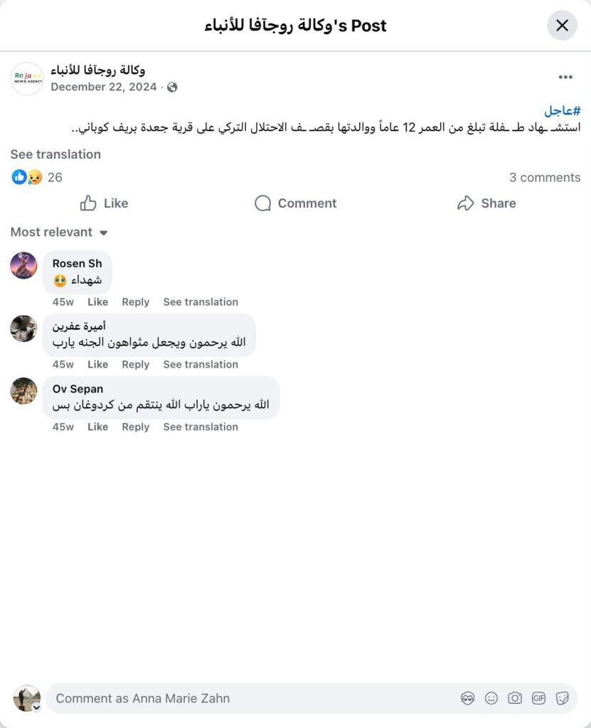 استشـ ـهاد طـ ـفلة تبلغ من العمر 12 عاماً ووالدتها بقصـ ـف الاحتلال التركي على قرية جعدة بريف كوباني..