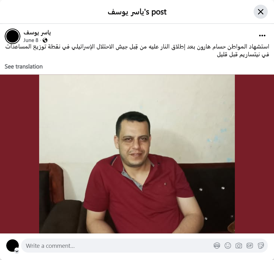 استشهاد المواطن حسام هارون بعد إطلاق النار عليه من قِبل جيش الاحتلال الإسرائيلي في نقطة توزيع المساعدات في نيتساريم قبل قليل