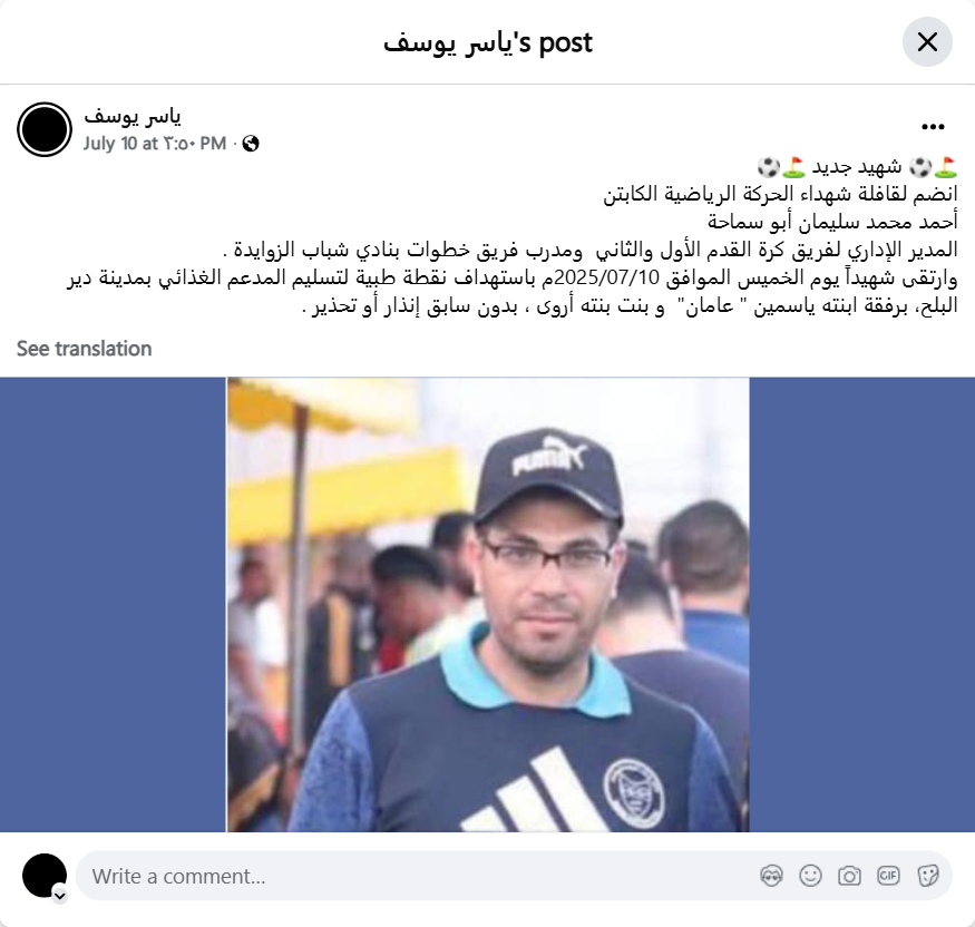 Captain Ahmed Mohammed Suleiman Abu Samah, the administrative director of the first and second football teams and coach of the Khatawat team at the Al-Zawaida Youth Club, has joined the ranks of martyrs of the sports movement. He was martyred on Thursday, July 10, 2025, when a medical point delivering food aid in the city of Deir al-Balah was targeted, accompanied by his two-year-old daughter Yasmine and his granddaughter Arwa, without prior warning.