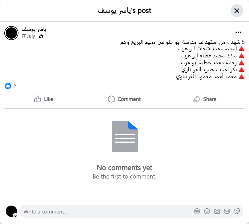 5 شهداء من استهداف مدرسة ابو حلو في مخيم البريج وهم