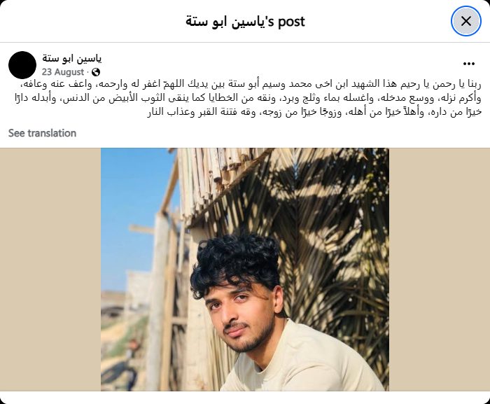 Our Lord, Most Gracious, Most Merciful, this martyr, my nephew Muhammad Waseem Abu Sitta, is in Your hands. O God, forgive him and have mercy on him, pardon him and grant him well-being, honor his abode, expand his entrance, wash him with water, snow, and hail, and purify him from sins as a white garment is purified from filth, and replace his home with a better home, his family with a better family, and his wife with a better wife, and protect him from the trial of the grave and the torment of the Fire.