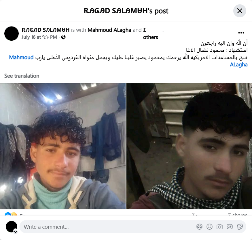 Suffocated by American aid. May God have mercy on you, Mahmoud. May He give us patience and grant him the highest place in Paradise, O Lord. Mahmoud ALagha