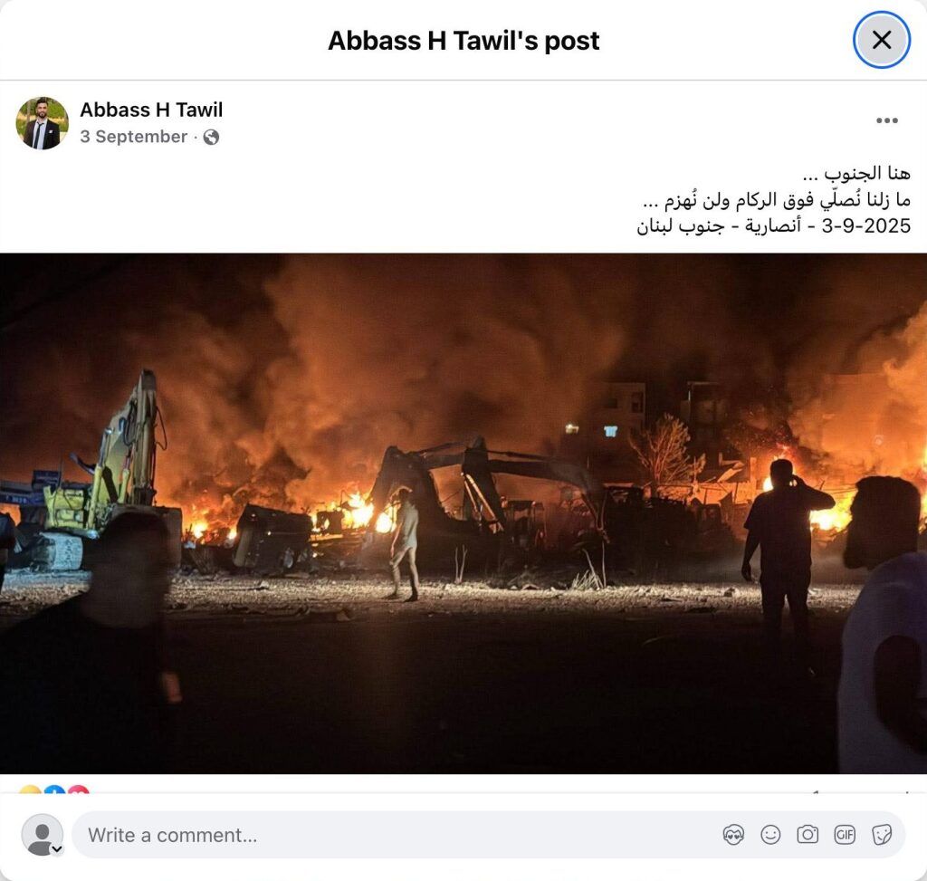 Archive URL: https://airwars.org/source/www-facebook-com-abbass-h-tawil-pfbid0xsaemsfsh2dgtyrcp9p34y4zquv5kudtmxe3cnmfl2q6lxb42qpqdmjaqbu8ax6tl-2025-09-03-090000/