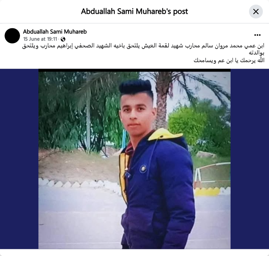 ابن عمي محمد مروان سالم محارب شهيد لقمة العيش يلتحق باخيه الشهيد الصحفي إبراهيم محارب ويلتحق بوالدته الله يرحمك يا ابن عم ويسامحك