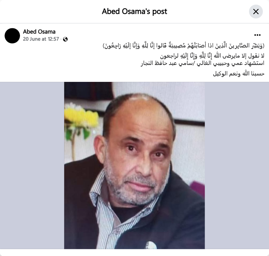 (And give good tidings to the patient, who, when disaster strikes them, say, "Indeed we belong to God, and indeed to Him we will return.") We only say what pleases God. Indeed, we belong to God, and indeed to Him we will return. The martyrdom of my uncle and beloved, Sami Abdel Hafez Al-Najjar. God is sufficient for us, and He is the best Disposer of affairs.