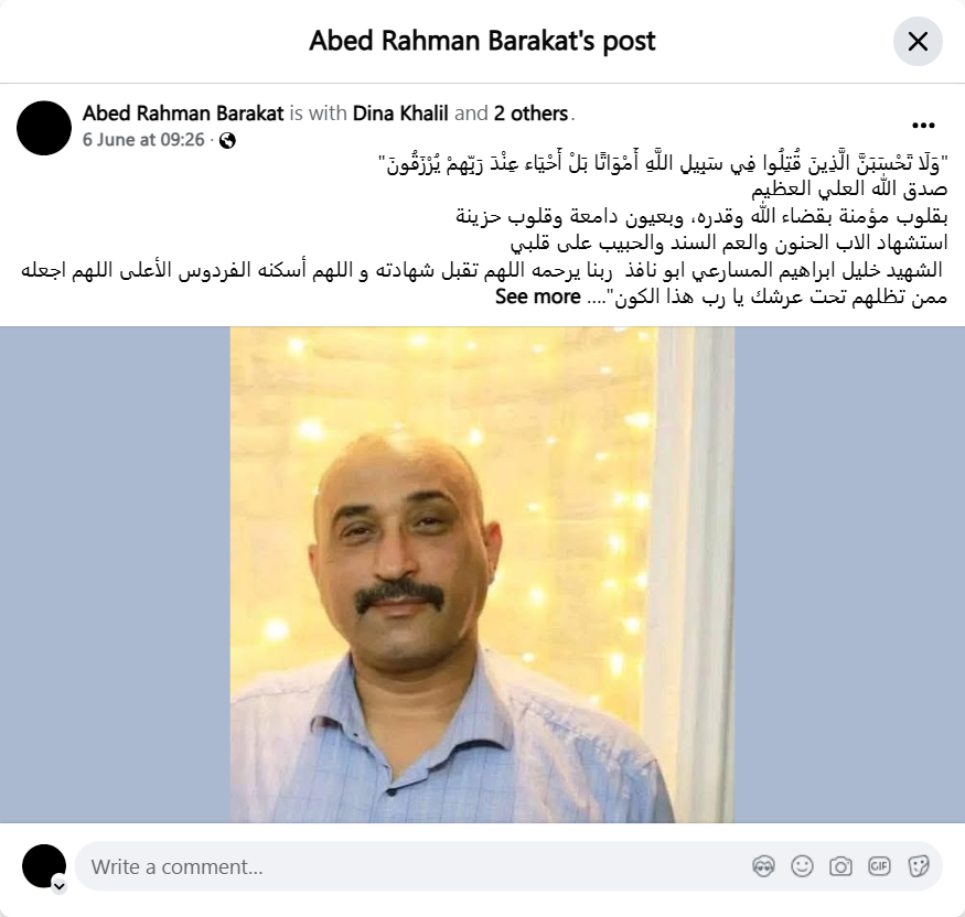 “And never think that those who have been killed in the cause of Allah are dead. Rather, they are alive with their Lord, and they are provided for.” God’s truth, the Almighty. With hearts that believe in God’s will and destiny, and with tearful eyes and sad hearts, the martyrdom of the caring father, the supportive uncle, and the beloved of my heart, the martyr Khalil Ibrahim Al-Masari, Abu Nafith. May our Lord have mercy on him. O God, accept his martyrdom and O God, let him dwell in the highest paradise. O God, make him among those whom You shade under Your throne, O Lord of this universe.”