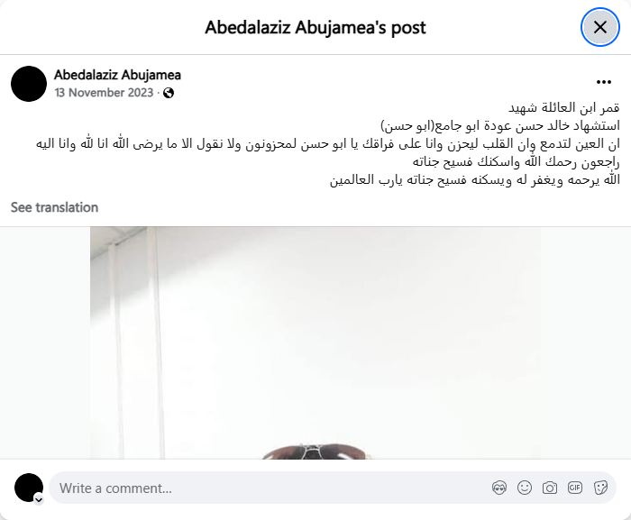 Qamar, son of the family, martyr, martyrdom of Khaled Hassan Awda Abu Jamea (Abu Hassan). The eye sheds tears and the heart is saddened, and we are saddened by your departure, Abu Hassan. We only say what pleases God. To God we belong and to Him we shall return. May God have mercy on you and grant you a place in His spacious gardens. May God have mercy on him, forgive him, and grant him a place in His spacious gardens, O Lord of the worlds.