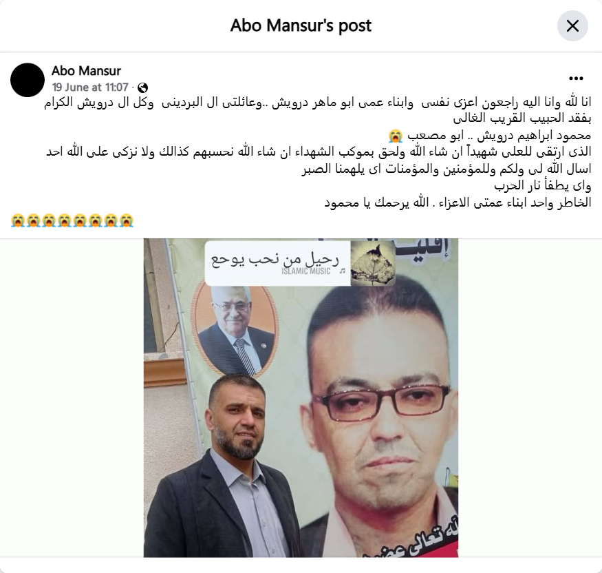 We belong to Allah and to Him we shall return. I offer my condolences to myself, my cousins Abu Maher Darwish, my Al-Bardini family, and all the honorable Al-Darwish family for the loss of our dear, close friend Mahmoud Ibrahim Darwish, Abu Musab, who ascended to the heavens as a martyr, God willing, and joined the procession of martyrs, God willing. We consider them as such, and we do not vouch for anyone before God. I ask God for me, for you, and for the believing men and women to inspire us with patience and to extinguish the fire of war. The heart of one of my dear cousins. May God have mercy on you, Mahmoud.
