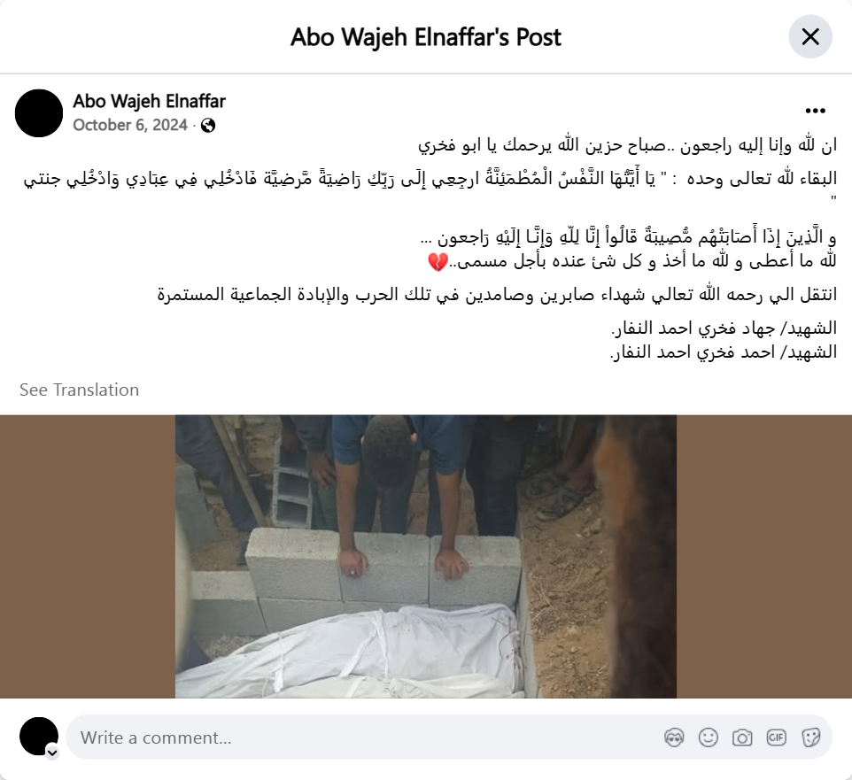 To Allah we belong and to Him we shall return.. A sad morning, may Allah have mercy on you, Abu Fakhry. To Allah alone is eternal: "O reassured soul, return to your Lord, well-pleased and pleasing [to Him], and enter among My servants and enter My Paradise." And those who, when disaster strikes them, say, "Indeed we belong to Allah, and indeed to Him we will return." To Allah belongs what He gives and to Allah belongs what He takes, and everything with Him has an appointed term.. The martyrs who were patient and steadfast in this war and the ongoing genocide, the martyr/ Jihad Fakhry Ahmed Al-Nafar, the martyr/ Ahmed Fakhry Ahmed Al-Nafar, have passed away to the mercy of Allah Almighty.