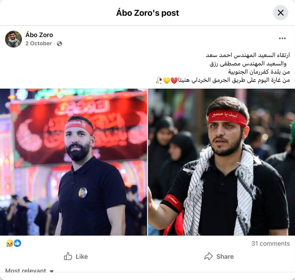 Congratulations to the families of the martyrs, Engineer Ahmad Saad and Engineer Mustafa Rizk, from the southern town of Kfar Rumman, who were killed in today's airstrike on the Jarmaq-Khardali road.