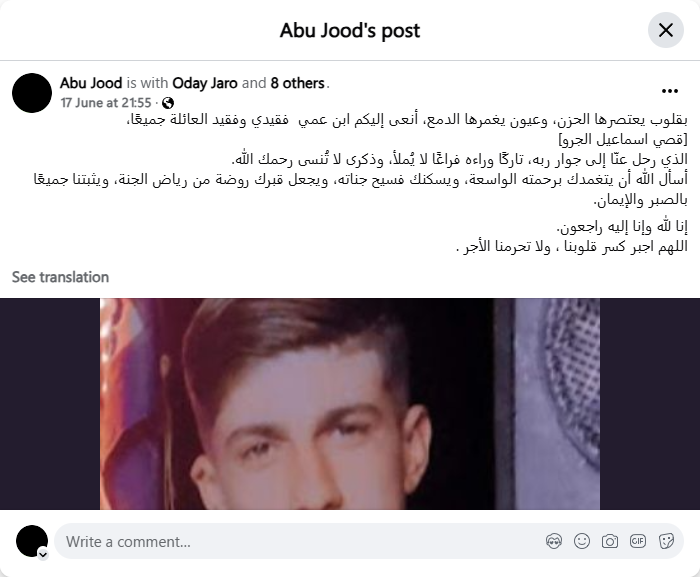 With hearts filled with sadness and eyes filled with tears, I announce to you the passing of my cousin, my beloved and the entire family, [Qusay Ismail Al-Jaru], who has passed away to be with his Lord, leaving behind an unfillable void and an unforgettable memory. May God have mercy on you. I ask God to have mercy on you with His vast mercy, to grant you a place in His spacious gardens, to make your grave a garden from the gardens of Paradise, and to strengthen us all with patience and faith. To God we belong and to Him we shall return. O God, mend our broken hearts and do not deprive us of the reward.