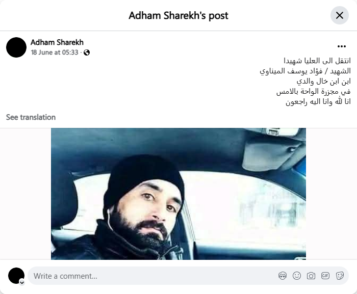 The martyr, Fouad Youssef Al-Minawi, my father’s cousin, passed away to the highest heaven in the Al-Waha massacre yesterday. To God we belong and to Him we shall return.