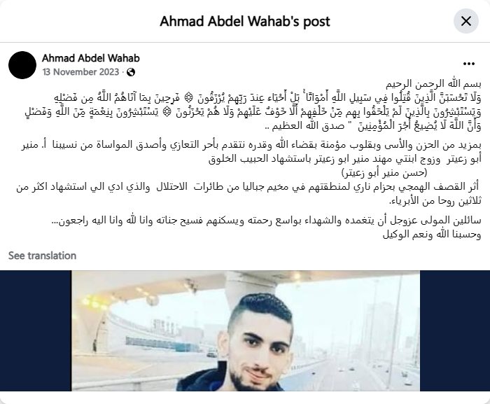 With great sadness and sorrow and with hearts that believe in God's will and destiny, we offer our deepest condolences and sincere sympathy to our relative Mr. Munir Abu Zaiter and my daughter's husband, Muhannad Munir Abu Zaiter, for the martyrdom of the beloved and honorable (Hassan Munir Abu Zaiter) as a result of the barbaric bombing with a fire belt of their area in Jabalia camp by the occupation aircraft, which led to the martyrdom of more than thirty innocent souls.