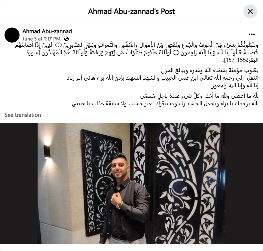 My beloved and honorable cousin, the martyr, Baraa Hani Abu Zanad, has passed away to the mercy of God Almighty.