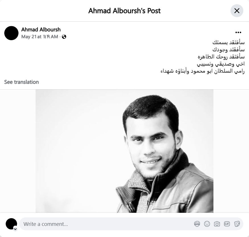 I will miss your smile, I will miss your presence, I will miss your pure soul, my brother, my friend, my relative Rami Sultan Abu Mahmoud and his sons, martyrs