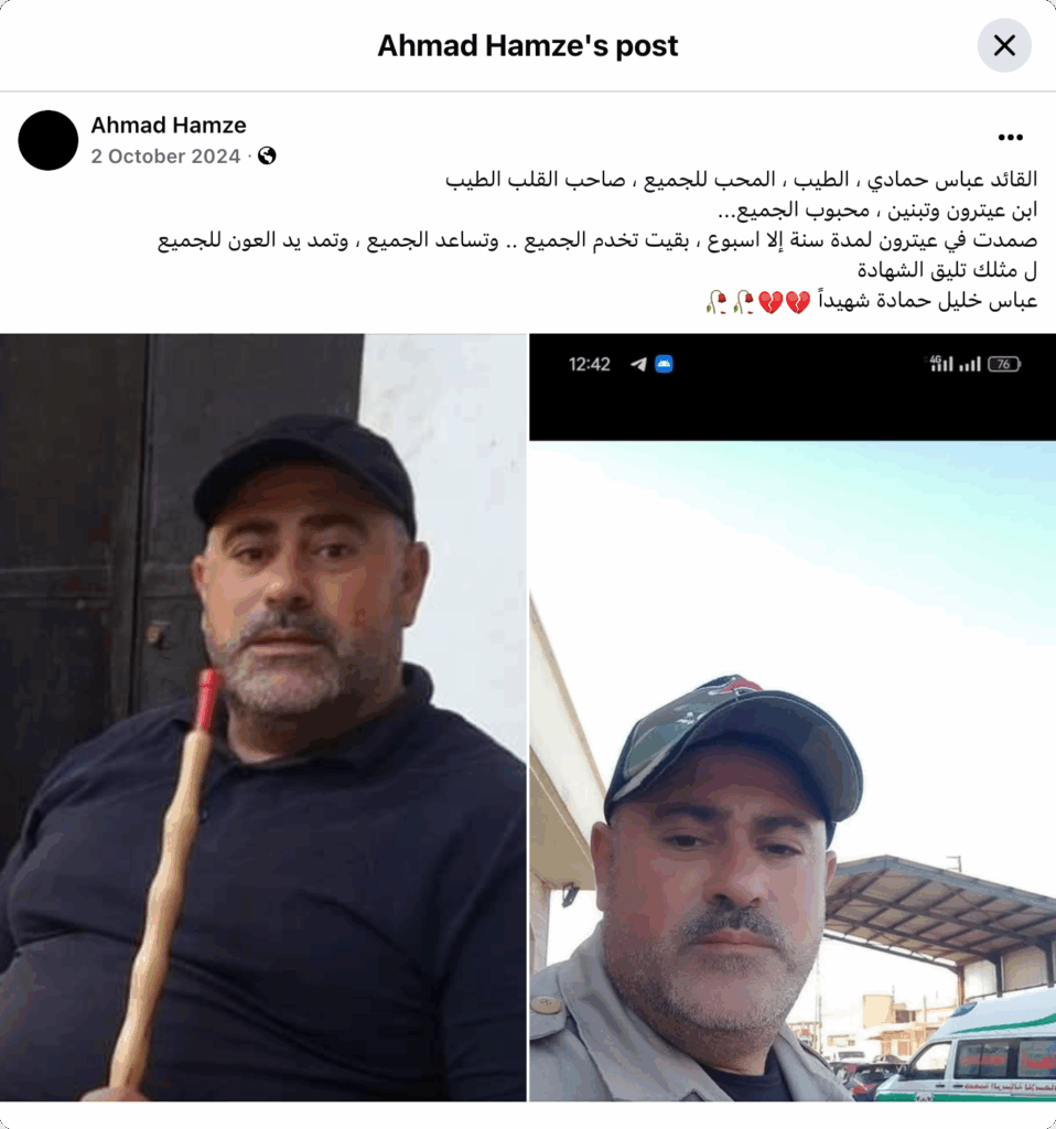 القائد عباس حمادي ، الطيب ، المحب للجميع ، صاحب القلب الطيب ابن عيترون وتبنين ، محبوب الجميع... صمدت في عيترون لمدة سنة إلا اسبوع ، بقيت تخدم الجميع .. وتساعد الجميع ، وتمد يد العون للجميع ل مثلك تليق الشهادة عباس خليل حمادة شهيداً