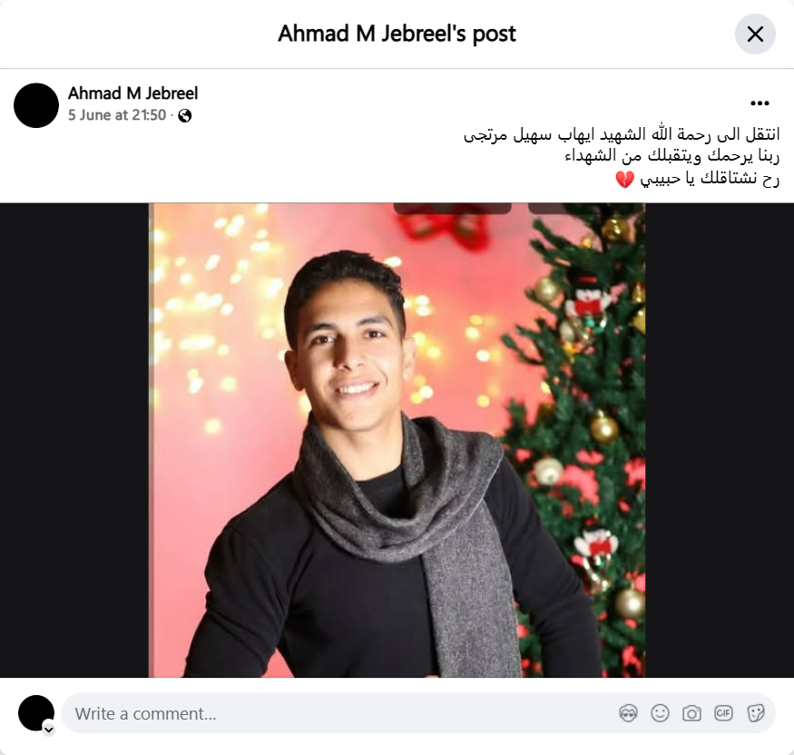 Martyr Ihab Suhail Murtaja has passed away. May God have mercy on you and accept you among the martyrs. We will miss you, my love.