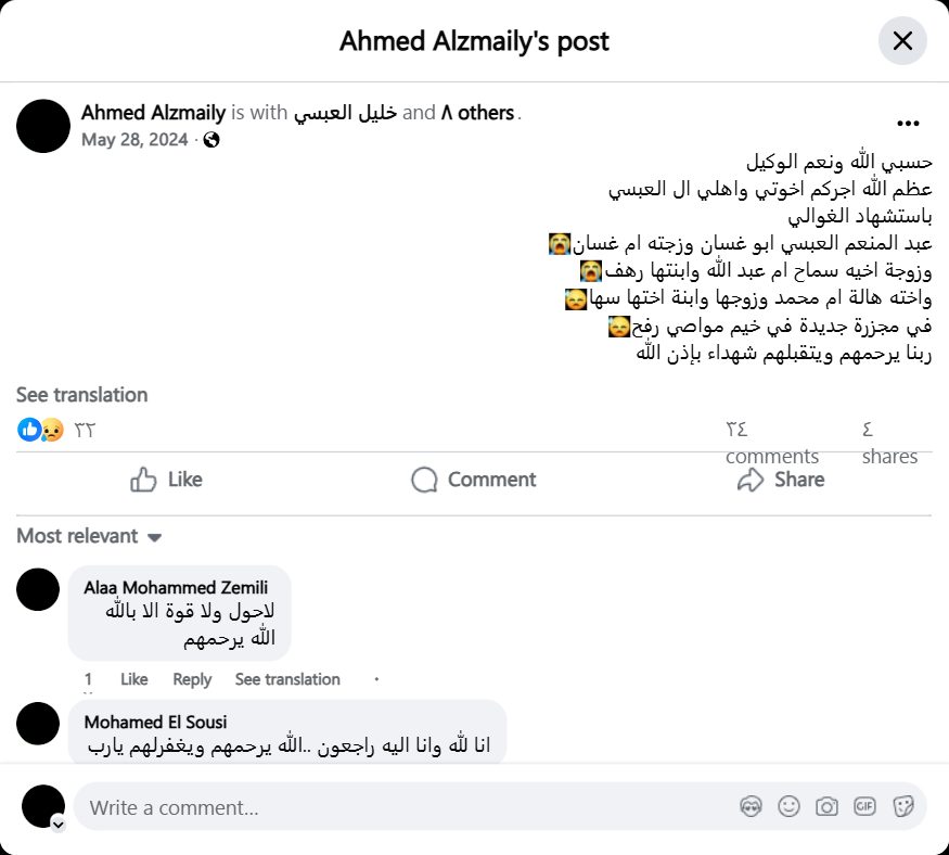 God is sufficient for us, and He is the best Disposer of affairs. May God reward you, my brothers and my family, the Al-Absi family. For the martyrdom of our dear ones: Abdul-Moneim Al-Absi, Abu Ghassan, and his wife, Umm Ghassan. His brother's wife, Samah, Umm Abdullah, and her daughter, Rahaf. His sister, Hala, Umm Muhammad, and her husband and niece, Suha. In a new massacre in the Mawasi tents in Rafah. May God have mercy on them and accept them as martyrs, God willing.