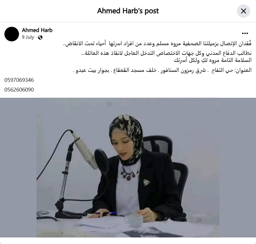 Contact has been lost with our colleague, journalist Marwa Muslim, and several members of her family are still alive under the rubble.