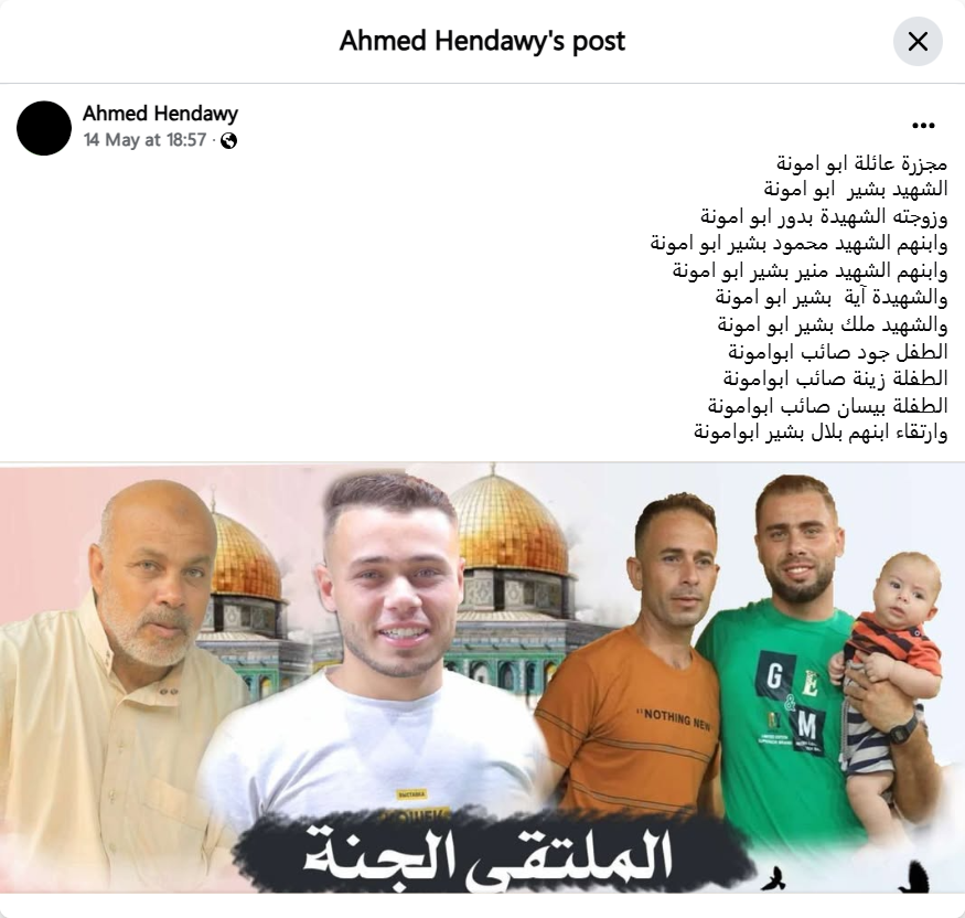 مجزرة عائلة ابو امونة الشهيد بشير ابو امونة وزوجته الشهيدة بدور ابو امونةوابنهم الشهيد محمود بشير ابو امونة وابنهم الشهيد منير بشير ابو امونة والشهيدة آية بشير ابو امونةوالشهيد ملك بشير ابو امونةالطفل جود صائب ابوامونة الطفلة زينة صائب ابوامونةالطفلة بيسان صائب ابوامونةوارتقاء ابنهم بلال بشير ابوامونة