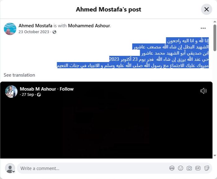 The heroic martyr, God willing, Musab Ashour, son of my friend, the martyr Muhammad Ashour, is alive with God and provided for, God willing. He passed away at dawn on October 23, 2023.