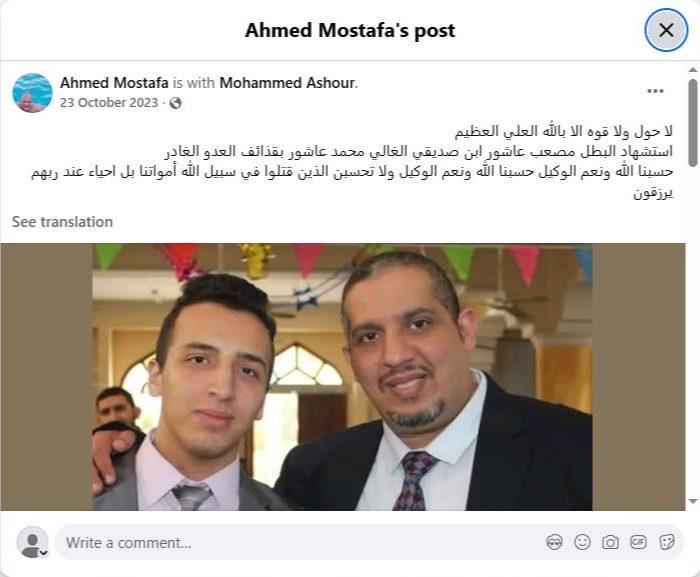 The heroic martyr Musab Ashour, son of my dear friend Muhammad Ashour, was killed by the treacherous enemy's shells.