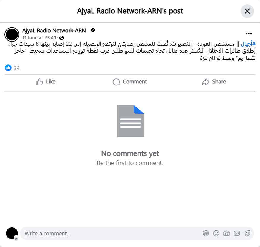 #أجيال || مستشفى العودة - النصيرات: نُقلت للمشفى إصابتان لترتفع الحصيلة إلى 22 إصابة بينها 8 سيدات جراء إطلاق طائرات الاحتلال المُسيّر عدة قنابل تجاه تجمعات للمواطنين قرب نقطة توزيع المساعدات بمحيط "حاجز نتساريم" وسط قطاع غزة