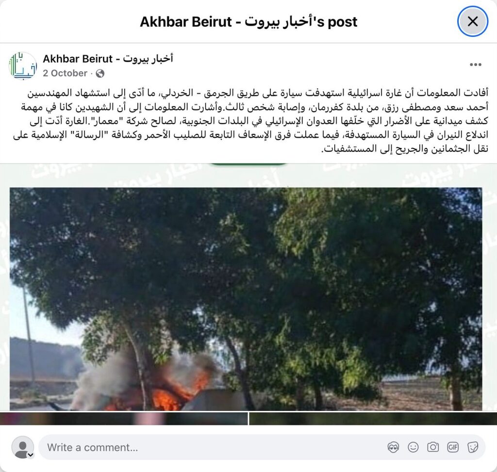 Reports indicate that an Israeli airstrike targeted a car on the Jarmaq-Khardali road, resulting in the deaths of engineers Ahmad Saad and Mustafa Rizk, from the town of Kfar Rumman, and injuring a third person. The reports also indicate that the two men were on a field survey of the damage caused by the Israeli aggression in southern towns, working for the Maamar Company. The airstrike caused the targeted car to burst into flames, and Red Cross and Al-Risala Islamic Scouts teams transported the bodies and the injured person to hospitals.