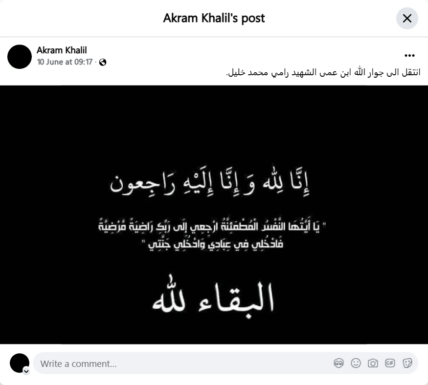 My cousin, the martyr Rami Muhammad Khalil, has passed away. All reactions: 1818