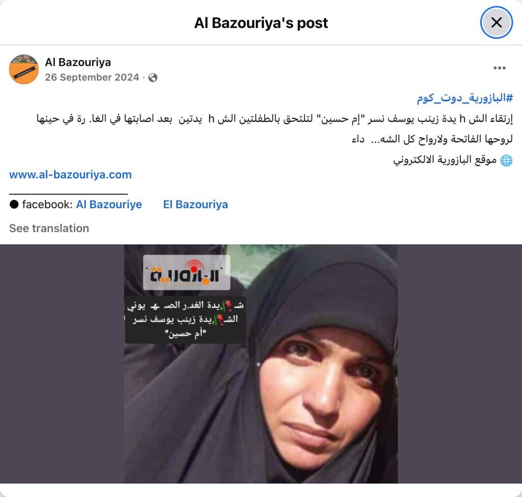 The martyrdom of Zainab Youssef Nasr "Um Hussein" to join the two martyred girls after she was injured in the raid at the time.