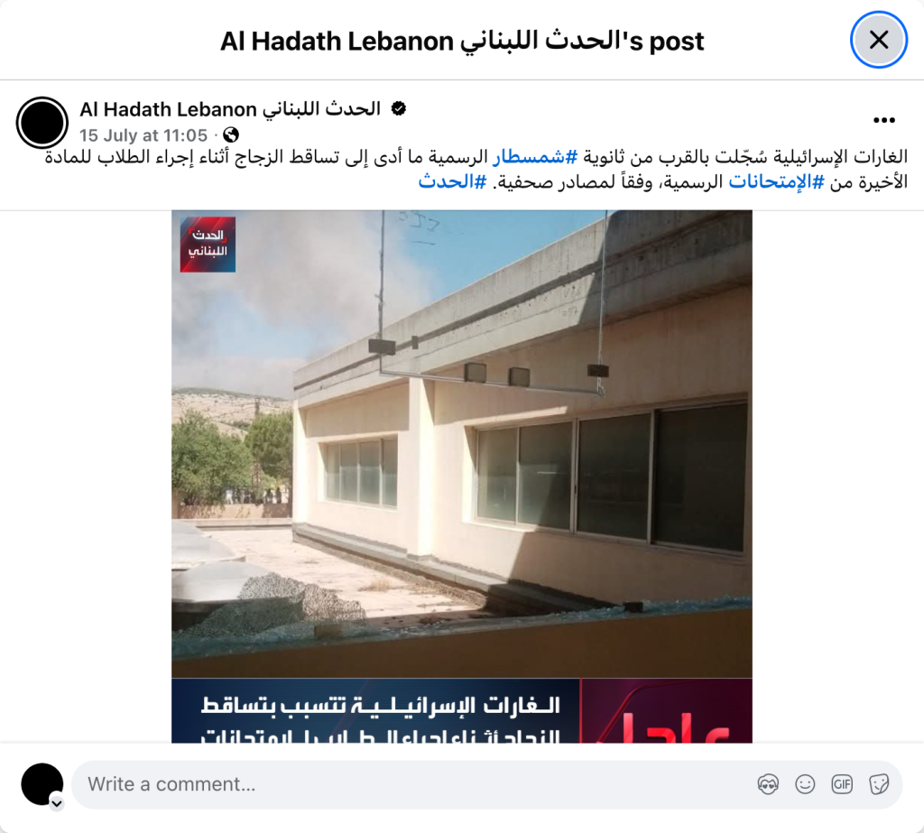 الغارات الإسرائيلية سُجّلت بالقرب من ثانوية #شمسطار الرسمية ما أدى إلى تساقط الزجاج أثناء إجراء الطلاب للمادة الأخيرة من #الإمتحانات الرسمية، وفقاً لمصادر صحفية. #الحدث