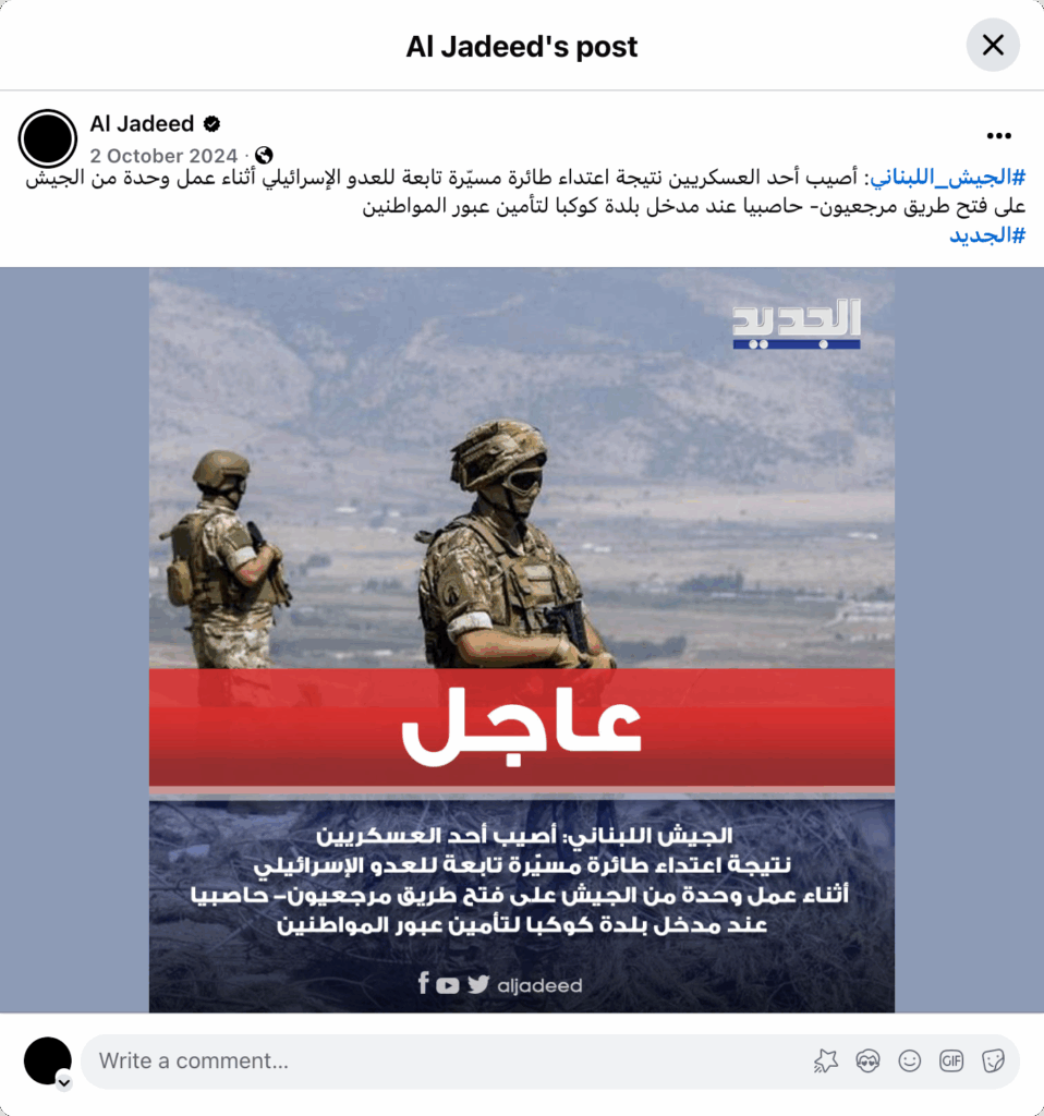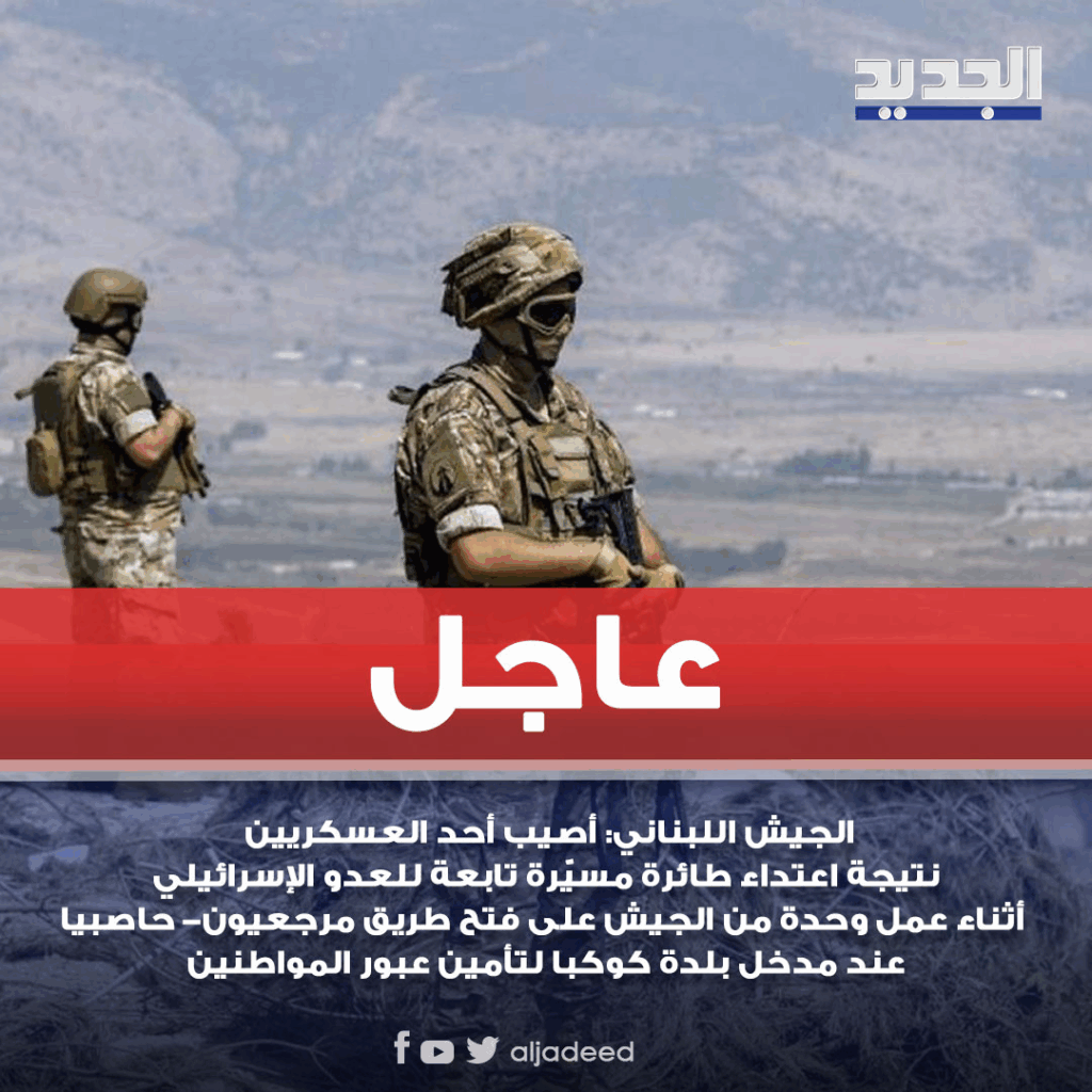 #الجيش_اللبناني: أصيب أحد العسكريين نتيجة اعتداء طائرة مسيّرة تابعة للعدو الإسرائيلي أثناء عمل وحدة من الجيش على فتح طريق مرجعيون- حاصبيا عند مدخل بلدة كوكبا لتأمين عبور المواطنين#الجديد