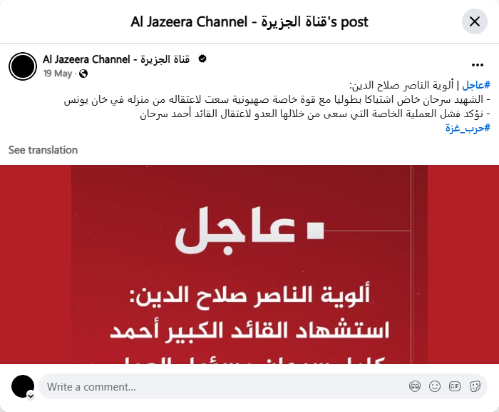 #Urgent | Al-Nasser Salah al-Din Brigades: - Martyr Sarhan engaged in a heroic clash with a special Zionist force that sought to arrest him from his home in Khan Yunis. - We confirm the failure of the special operation through which the enemy sought to arrest Commander Ahmed Sarhan. #Gaza_War