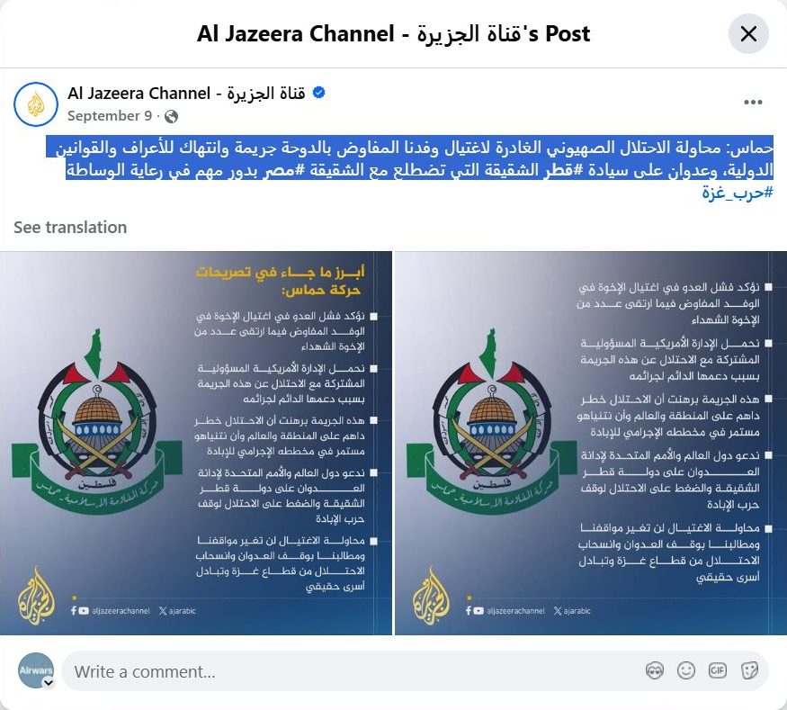 Hamas: The treacherous attempt by the Zionist occupation to assassinate our negotiating delegation in Doha is a crime and a violation of international norms and laws, and an aggression against the sovereignty of our sister nation #Qatar, which, along with our sister nation #Egypt, plays an important role in sponsoring the mediation.
