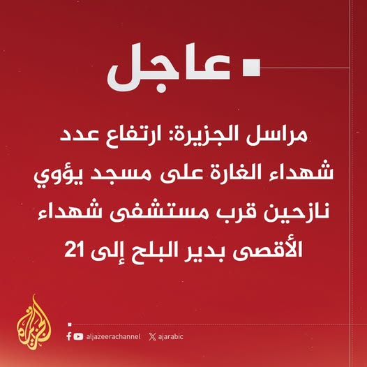 عاجل | مراسل #الجزيرة: ارتفاع عدد شهداء الغارة على مسجد يؤوي نازحين قرب مستشفى شهداء الأقصى بدير البلح إلى 21
