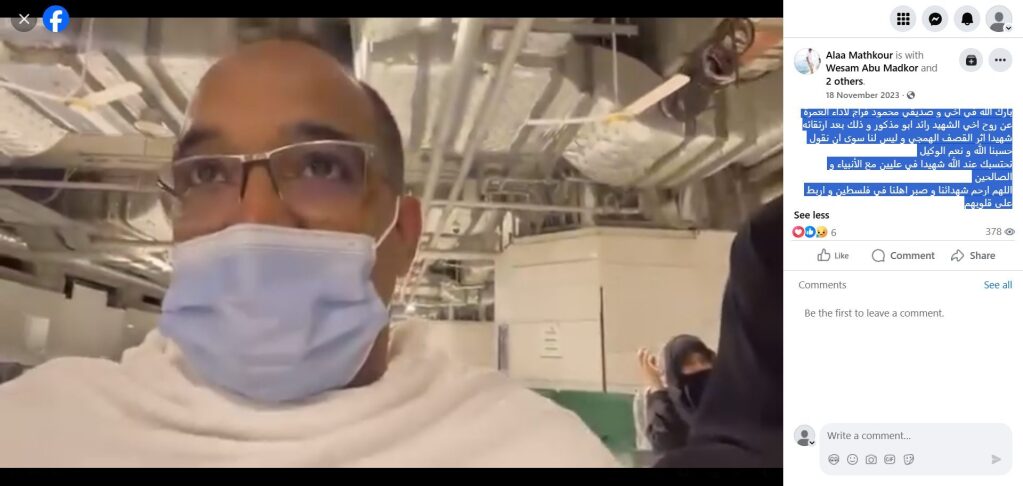 May God bless my brother and friend Mahmoud Faraj for performing Umrah on behalf of my martyred brother Raed Abu Madhkour, who was killed in the barbaric bombing. We can only say, "Sufficient for us is God, and He is the best Disposer of affairs." We consider you a martyr in the highest ranks of Paradise with the prophets and the righteous. O God, have mercy on our martyrs, grant patience to our people in Palestine, and strengthen their hearts.