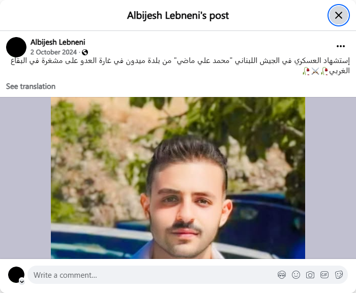 Lebanese Army soldier "Mohammad Ali Madi" from the town of Midoun was martyred in an enemy raid on Mashghara in the Western Bekaa.