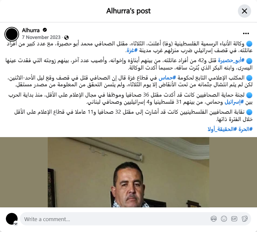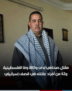 The official Palestinian news agency (WAFA) announced on Tuesday the killing of journalist Mohammed Abu Hasira, along with a large number of his family members, in an Israeli bombing that hit their home west of Gaza City. Abu Hasira was killed along with 42 members of his family, including his sons and brothers, and several others were injured, including his wife, who lost her left eye, and his eldest son, who had his leg amputated, according to the agency. The media office of the Hamas government in the Gaza Strip said that the journalist was killed in a bombing that occurred on the night of Sunday-Monday, but his body was not recovered from under the rubble until Tuesday, and the information could not be independently verified. The Committee to Protect Journalists had confirmed the killing of at least 36 journalists and media workers since the beginning of the war between Israel and Hamas, including 31 Palestinians, 4 Israelis, and a Lebanese journalist. The Palestinian Journalists Syndicate had indicated that at least 32 journalists and 11 media workers were killed during the same period. #Freedom #TruthFirst