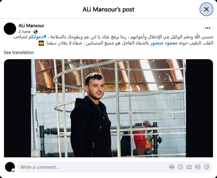 حسبي الله ونعم الوكيل في الإحتلال وأعوانهم ، ربنا يرفع عنك يا ابن عم ويقومك بالسلامة ، #دعواتكم لصاحب القلب الطيب حوته محمود منصور بالشفاء العاجل هو جميع المصابين ، شفاءً لا يغادر سقما دعواتكم للغالي/ محمود منصور #حوتا