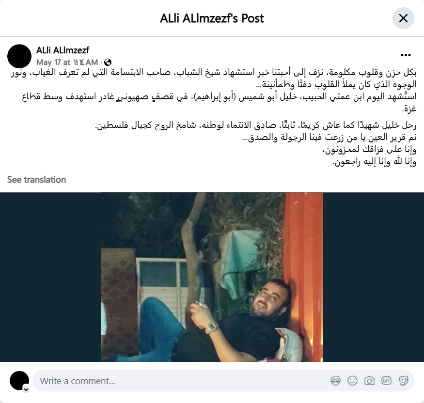 With great sadness and broken hearts, we inform our loved ones of the martyrdom of the Sheikh of Youth, the owner of the smile that never faded, and the light of faces that filled hearts with warmth and reassurance... Today, my beloved cousin, Khalil Abu Shamis (Abu Ibrahim), was martyred in a treacherous Zionist bombing that targeted the central Gaza Strip. Khalil departed as a martyr, just as he lived: generous, steadfast, true to his homeland, and with a spirit as lofty as the mountains of Palestine. Sleep in peace, you who planted manhood and honesty in us... We are saddened by your departure, and to God we belong and to Him we shall return.
