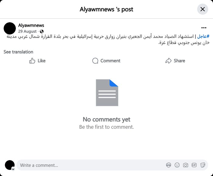 #Urgent | Fisherman Mohammed Ayman al-Ja'bari was killed by Israeli gunboat fire off the coast of al-Qarara, northwest of Khan Yunis, in the southern Gaza Strip.