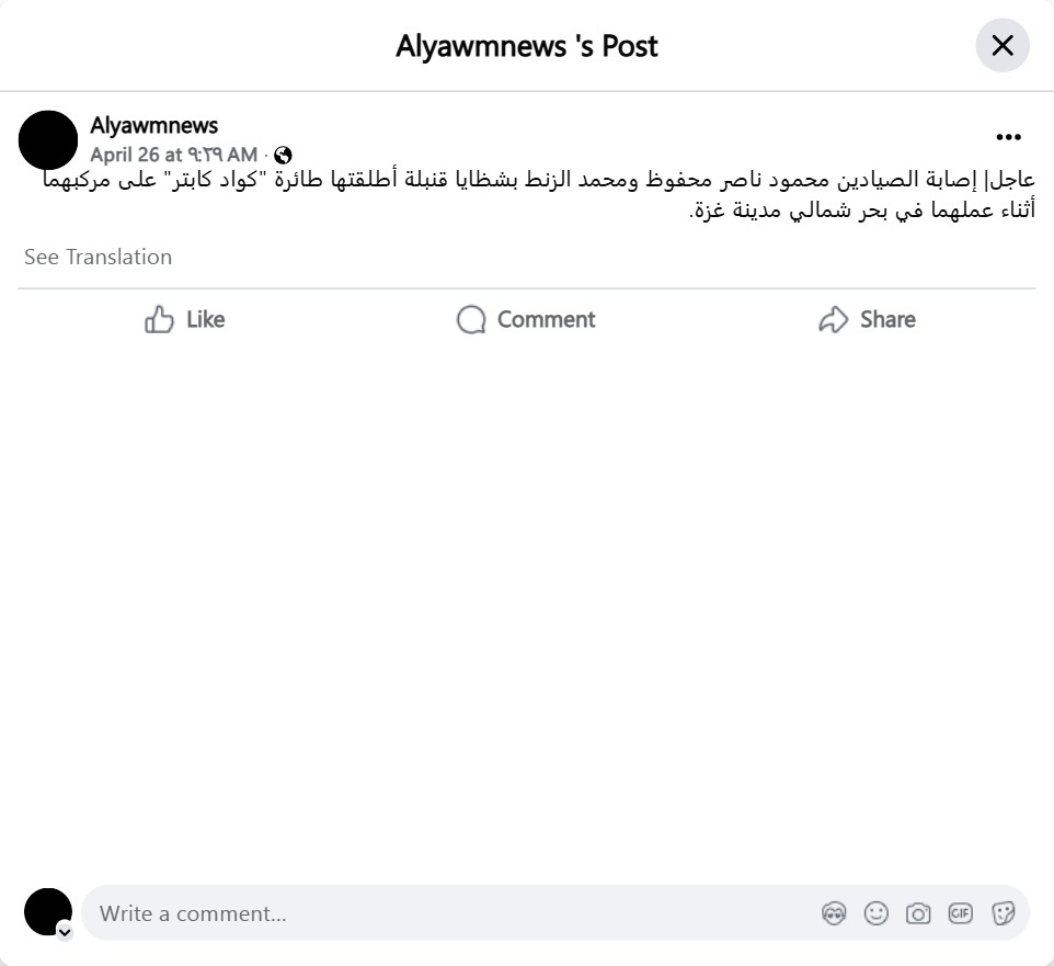 Urgent | Fishermen Mahmoud Nasser Mahfouz and Mohammed Al-Zant were injured by shrapnel from a bomb fired by a quadcopter drone at their boat while they were working in the sea north of Gaza City. See translation Like Comment Share