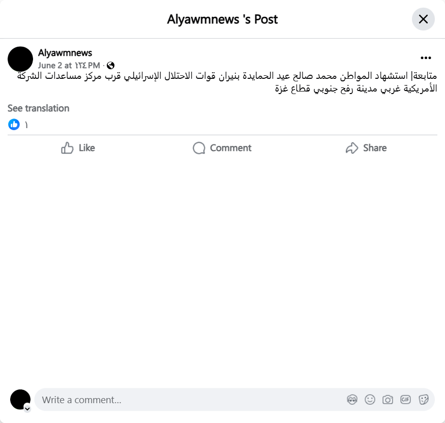 Follow-up | Citizen Mohammed Saleh Eid Al-Humaida was martyred by Israeli occupation forces' fire near the American company's aid center west of Rafah, in the southern Gaza Strip.
