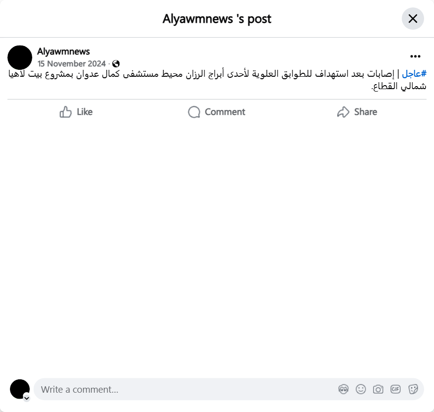 #عاجل | إصابات بعد استهداف للطوابق العلوية لأحدى أبراج الرزان محيط مستشفى كمال عدوان بمشروع بيت لاهيا شمالي القطاع.
