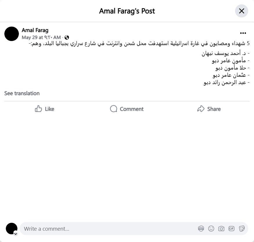 5 شهداء ومصابون في غارة اسرائيلية استهدفت محل شحن وانترنت في شارع سراري بجباليا البلد، وهم:-