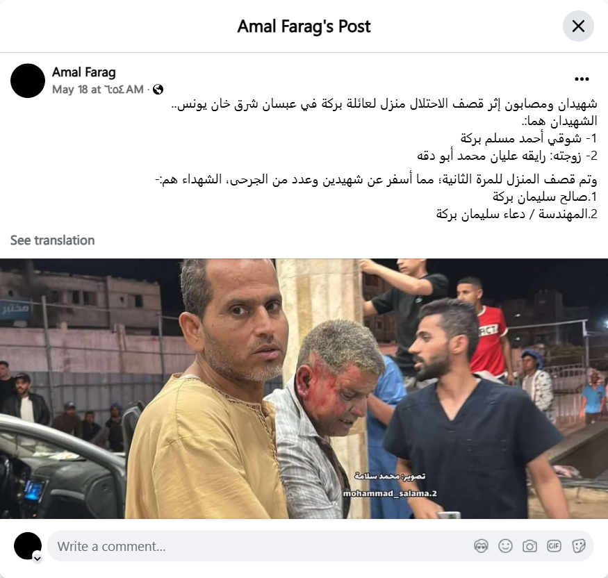 The house was bombed for the second time, resulting in two martyrs and a number of wounded. The martyrs are: 1. Saleh Suleiman Baraka 2. Engineer Duaa Suleiman Baraka