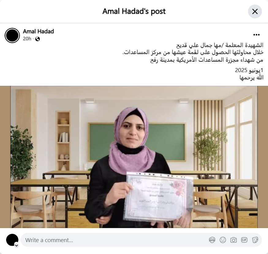 Martyr teacher Maha Jamal Ali Qadih was killed while trying to earn a living from the aid center. One of the martyrs of the American aid massacre in Rafah, June 1, 2025. May God have mercy on her soul.